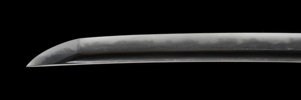 戦国時代に名をはせた伊達政宗・池田長吉らが所持した後、2代将軍徳川秀忠に召し上げられ、3代将軍徳川家光の御成に際して尾張徳川家初代義直へ下賜された刀です。 本阿弥光徳により相模国(神奈川県)の名工・正宗の作と極められています。身幅が広く切先も伸びた雄大な造りで、地鉄には大模様の肌が交じっています。刃文は湾れに乱れが交じり、金筋や飛焼きなど多彩な変化も入る、見どころの多い逸品です。