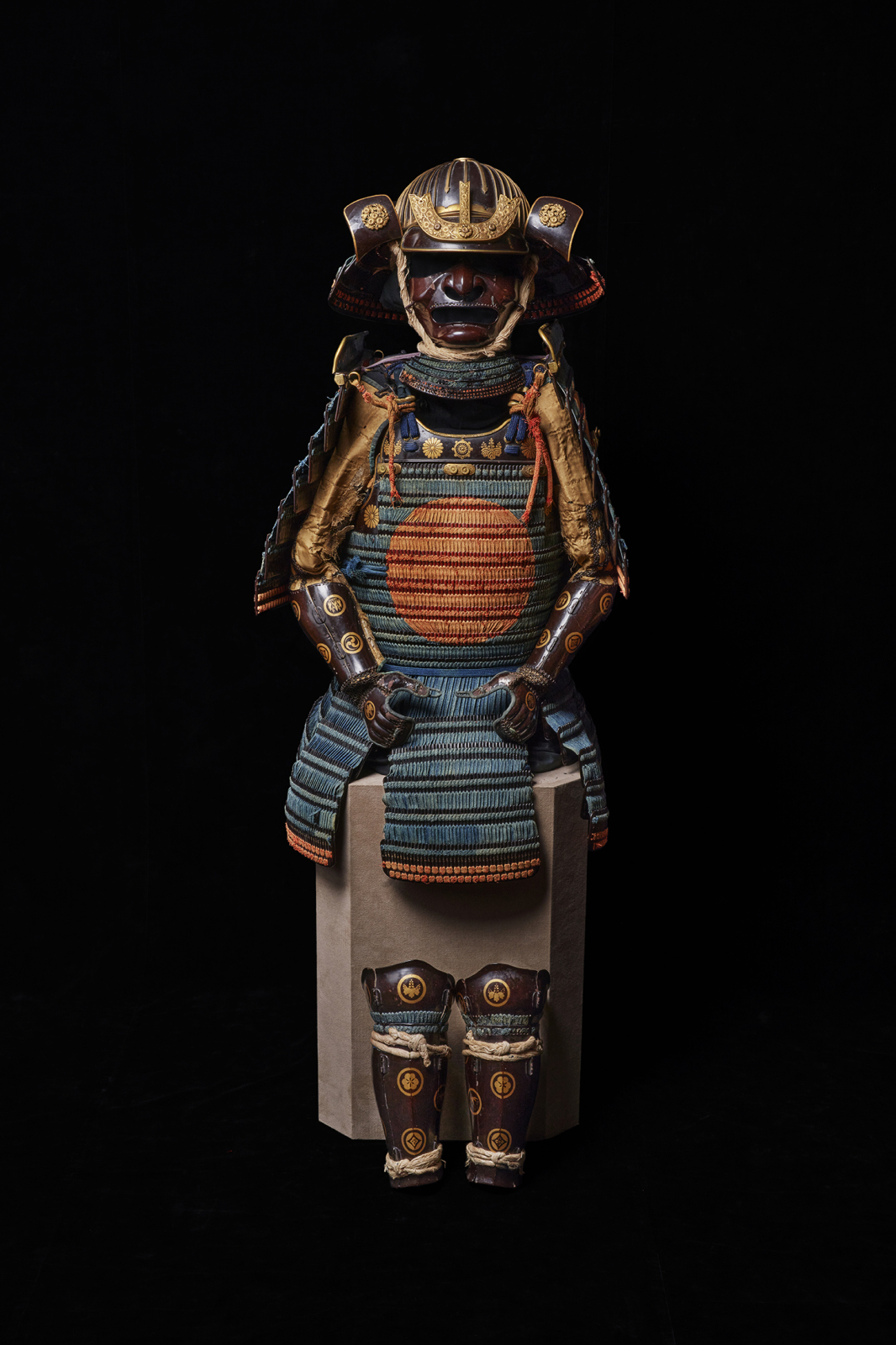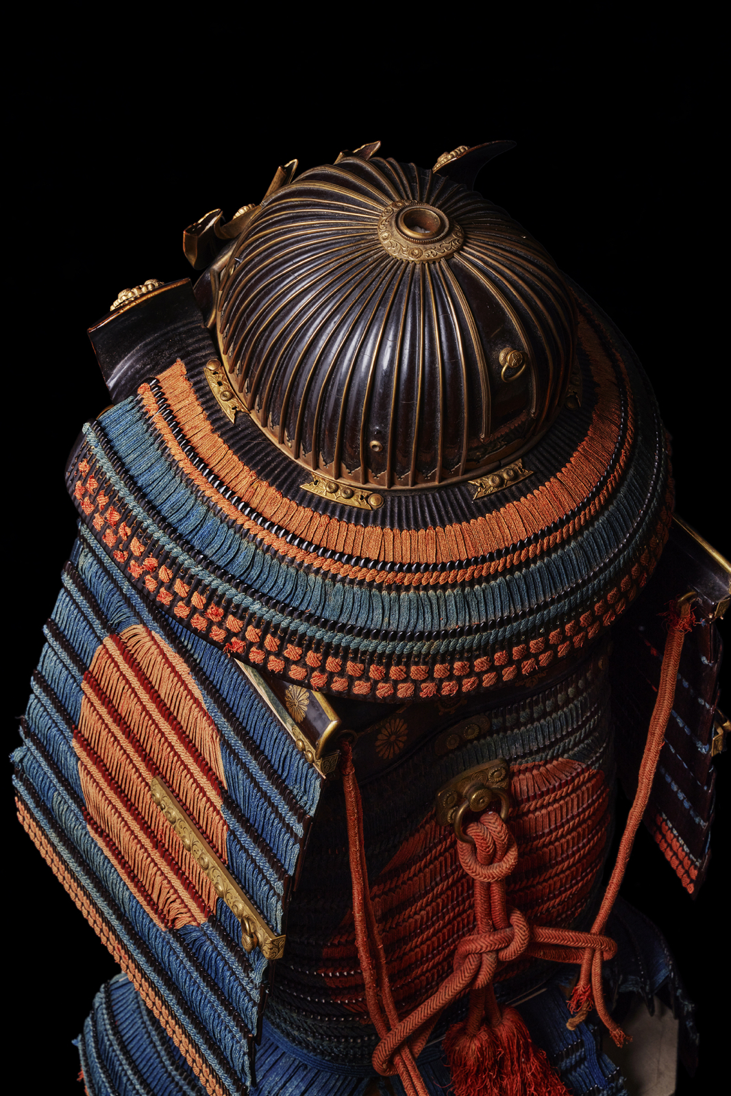 | 作品名 | 花色日の丸威胴丸具足 | "Gusoku" Helmet and Armor, red sun design, red and blue lacing. |